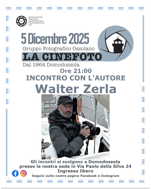 Cari soci, amici e simpatizzanti, il 2025 volge al termine e anche il gruppo La Cinefoto si prenderà una pausa prima di iniziare un nuovo anno ricco di incontri, ospiti e graditi ritorni.Prima di dedicarci ai festeggiamenti e ai cenoni, vi invitiamo all’ultima serata del 2025 fissata per il 5 dicembre - ore 21 - presso la nostra sede, con la partecipazione del fotografo professionista Walter Zerla che ci presenterà la nuova edizione 2026 del libro fotografico “Lago Maggiore e d’Orta in barca a vela”. L’opera iniziale nasceva da tre anni vissuti interamente in barca, tre anni di vela e di attesa, di scatti rubati alle albe e ai tramonti, trasformati in immagini che custodiscono l’intimità e l’anima dei due laghi. La riedizione 2026 non è una semplice ristampa: è un libro rinnovato, arricchito da immagini inedite realizzate anche grazie all’ausilio di un drone. Come lo sguardo libero di un gabbiano, le fotografie sorvolano porti, paesi e rive, regalando una visione sospesa che intreccia cielo, acqua e pietra in un’unica narrazione. Ogni immagine diventa parte di una sinfonia visiva che celebra l’incontro tra uomo, natura e tempo. Questa nuova edizione si lega inoltre al progetto scientifico “Sailing”, promosso dal CNR di Pallanza e sostenuto dalla Fantini Rubinetti, per lo studio della qualità delle acque e della sostenibilità dei nostri laghi.